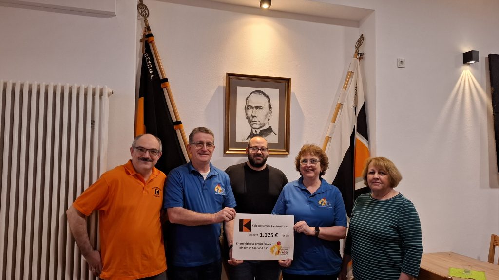 Nachdem die Kolpingsfamilie schon im Rahmen der Adventsfenster und zum Spendenbarometer einen Teil der im vergangenen Jahr erzielten Erlöse gespendet hatte, wurde nun zu Beginn des Jubiläumsjahres „125 Jahre Kolpingsfamilie Landstuhl“ eine gesonderte Spende an die „Elterninitiative krebskranker Kinder im Saarland e.V.“ übergeben. Im Sinne Adolph Kolpings fördert die Kolpingsfamilie Landstuhl solidarisches Handeln und setzt sich für Familien ein. Somit fiel die Entscheidung zur finanziellen Unterstützung der Elterninitiative leicht, da man so auch lokal helfen kann. Passend zum Jubiläumsjahr wurde vom Vorsitzenden Daniele de Fazio im Kolpinghaus ein Betrag von 1.125€ an Christel und Wolfgang Noll übergeben. Beide waren sehr erfreut und dankten recht herzlich für die Spende.